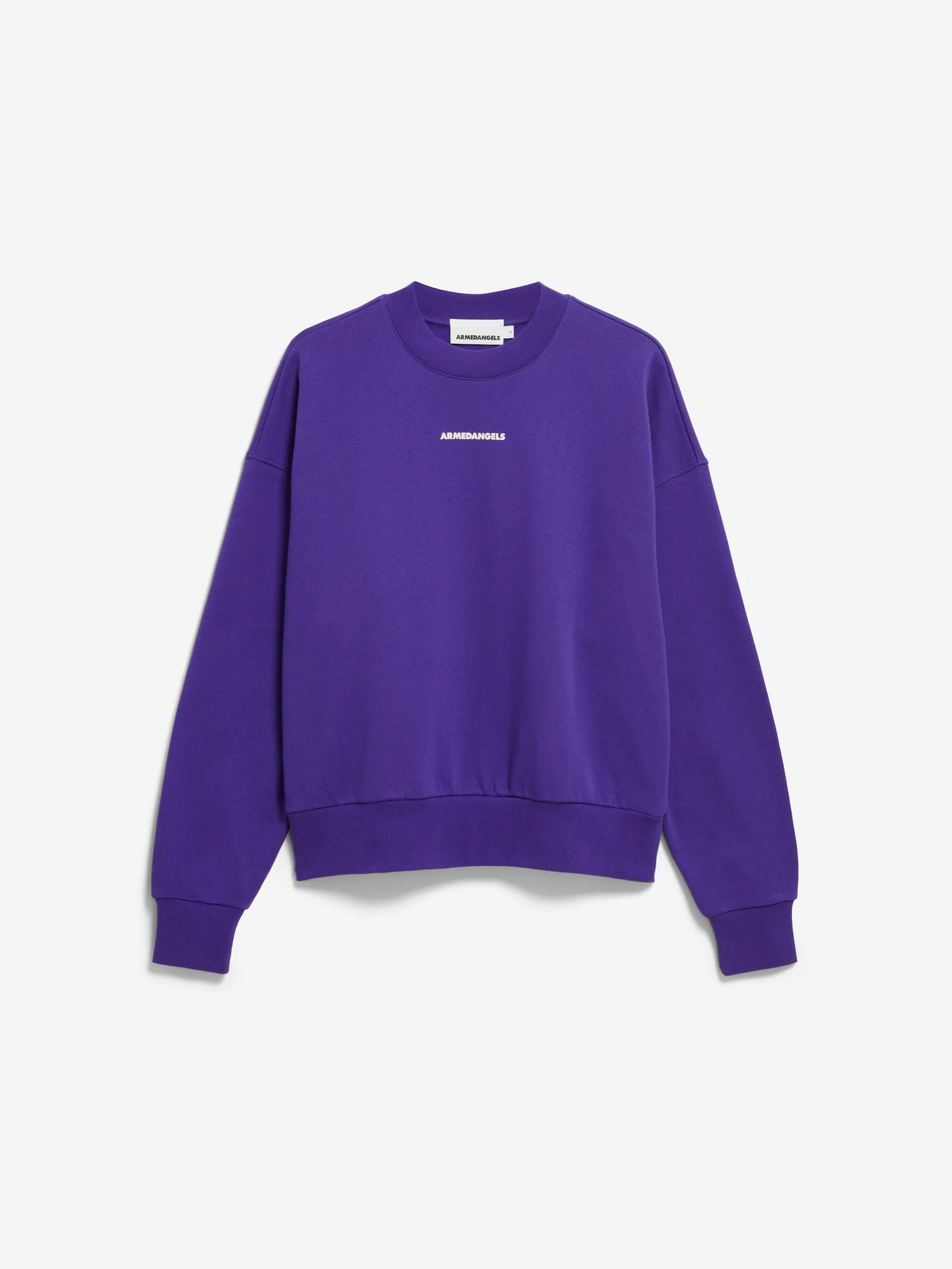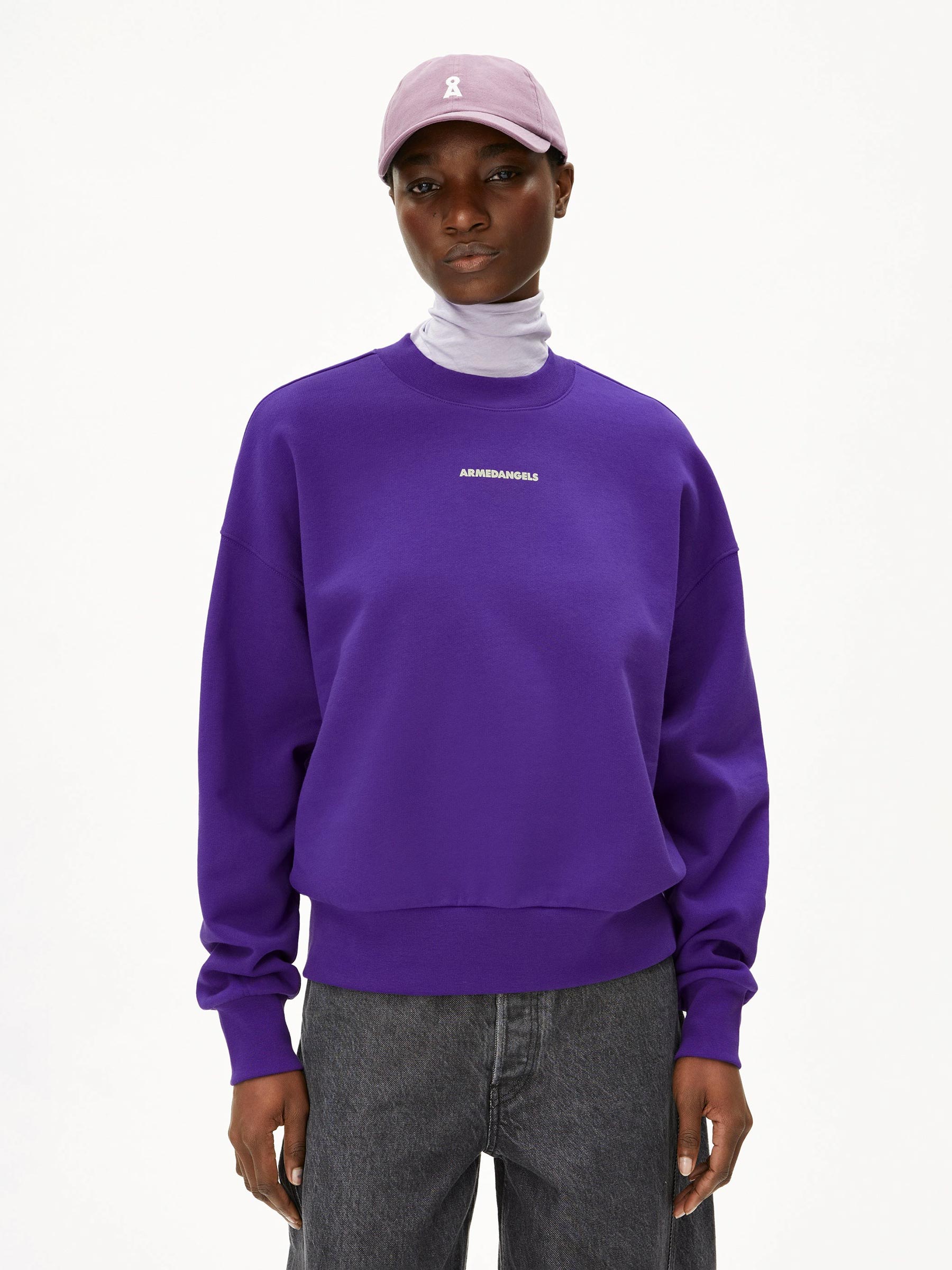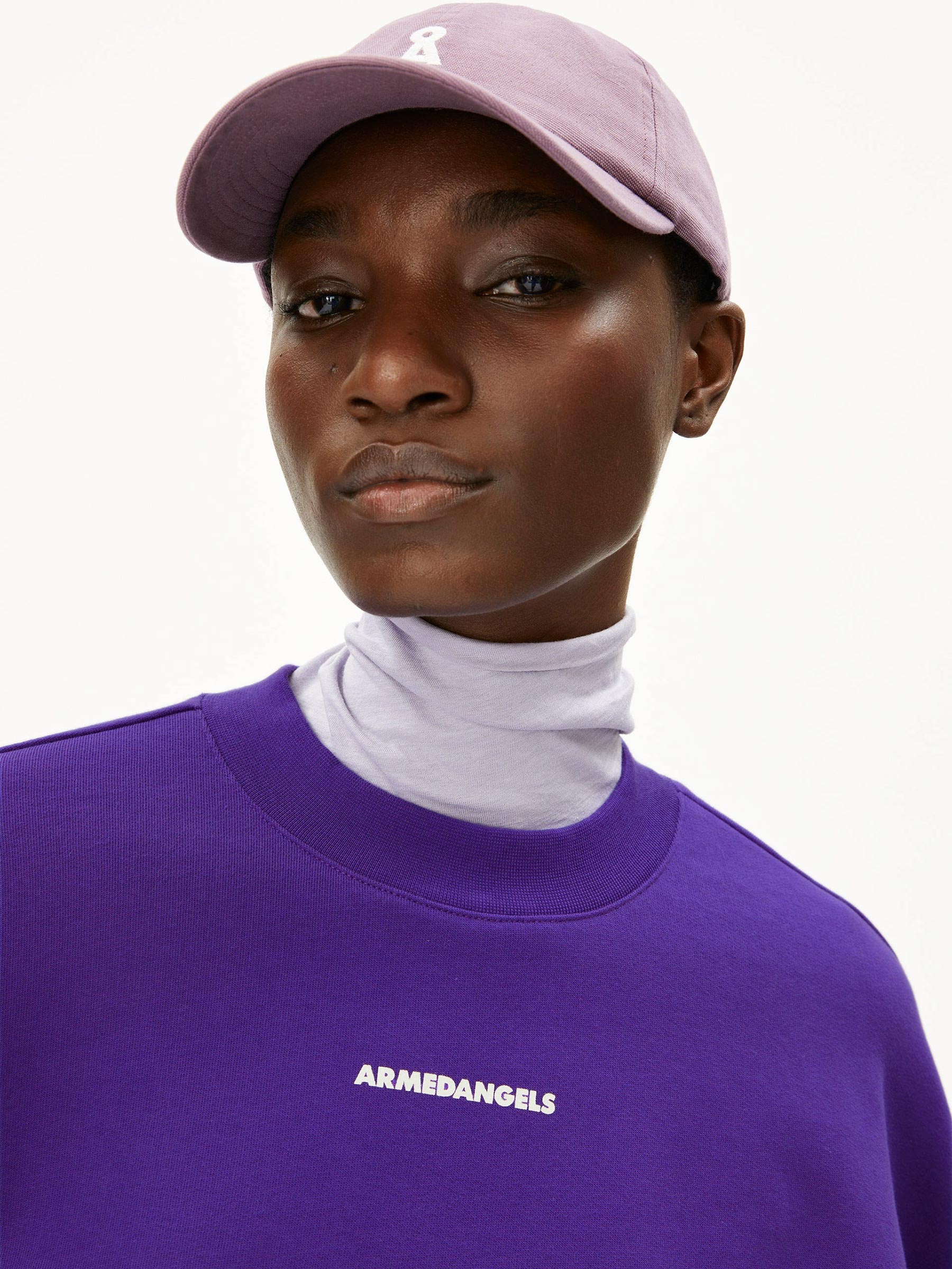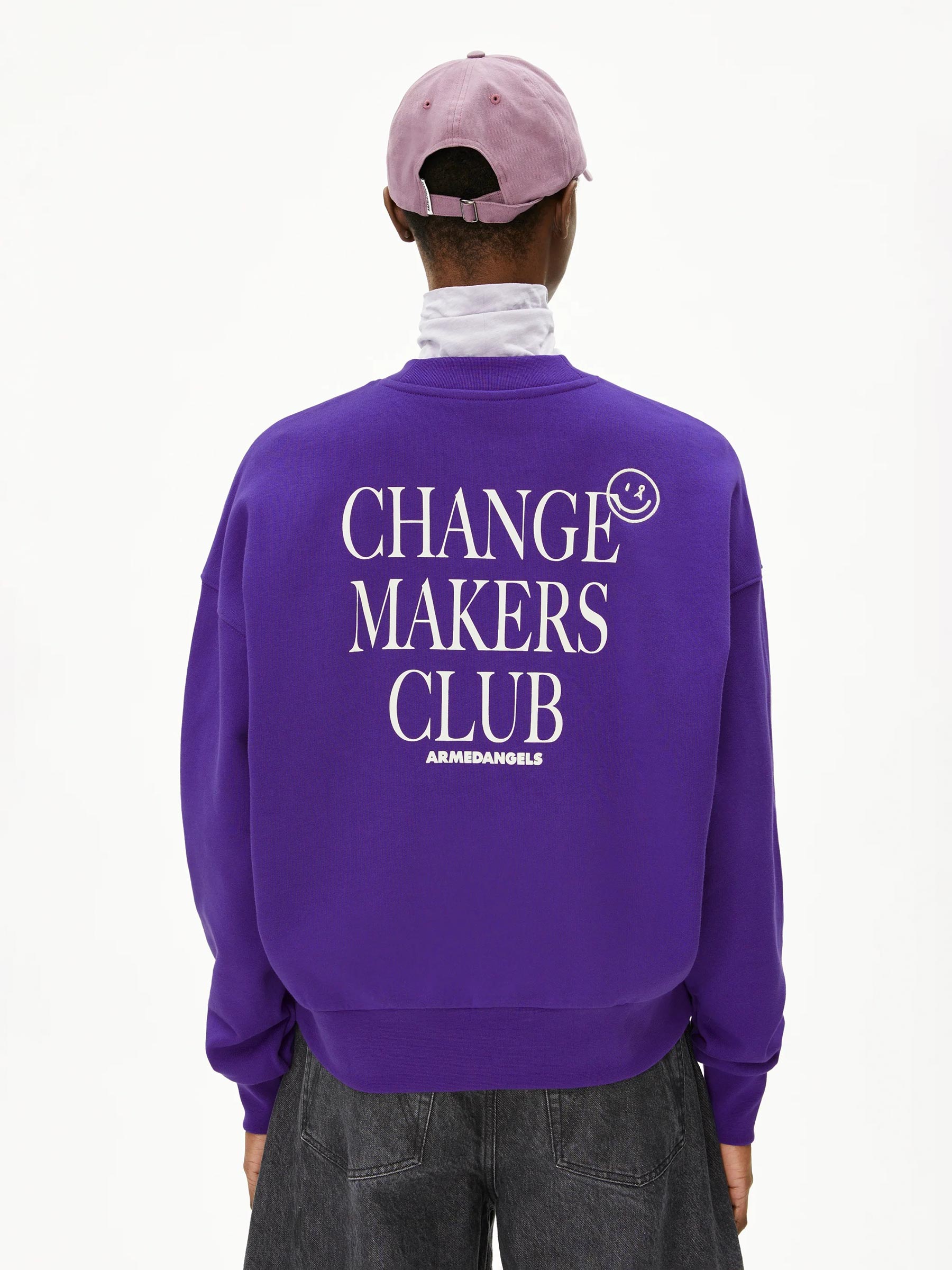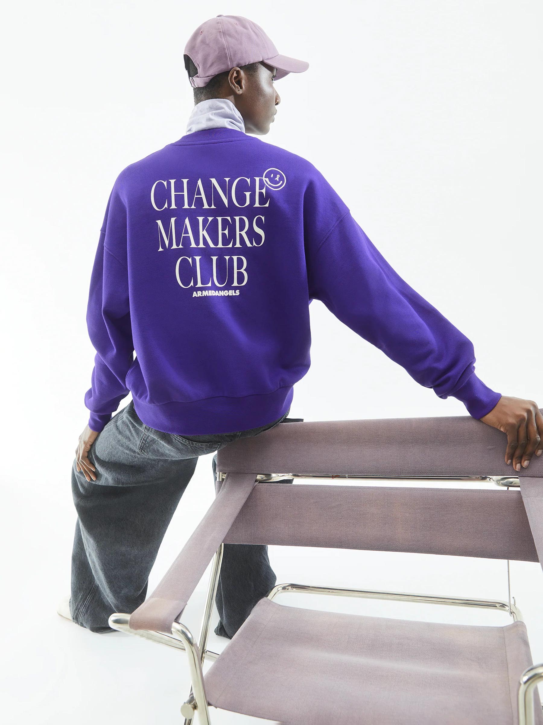 Deze paarse sweater van Armedangels maakt meteen een statement. Aan de voorkant subtiel, aan de achterkant bold met de tekst Changemakers Club. Gemaakt van biologisch katoen in een relaxed fit die je moeiteloos elke dag wilt dragen.