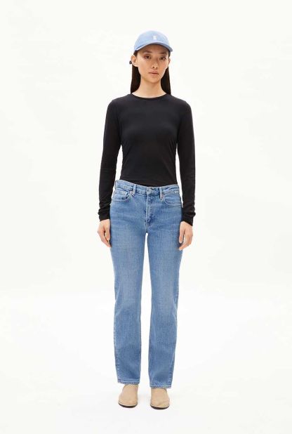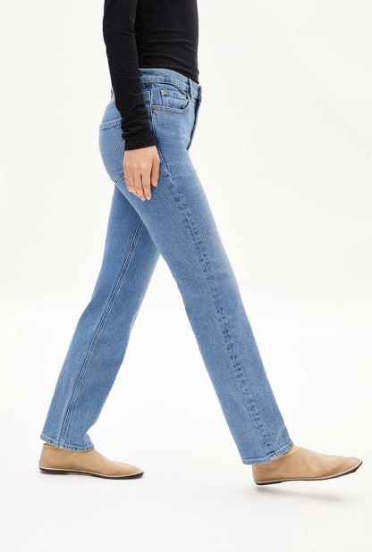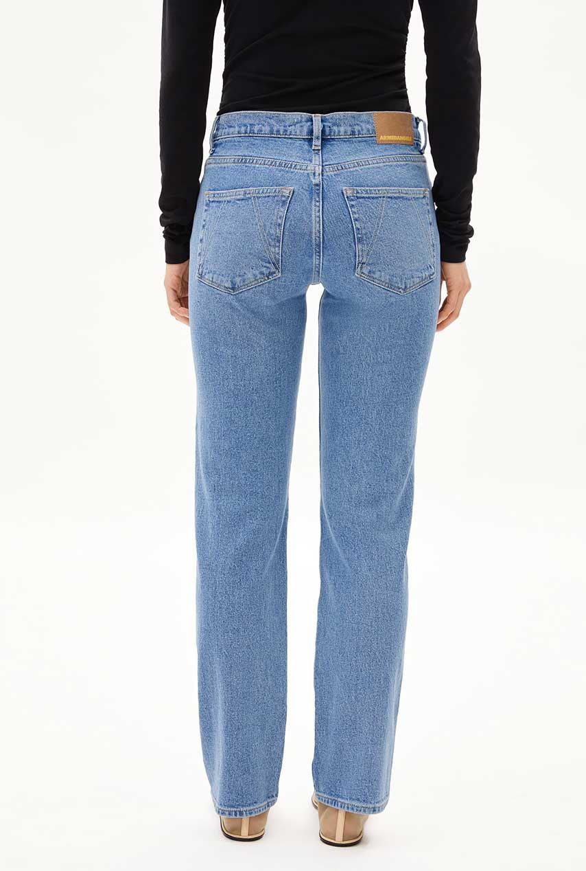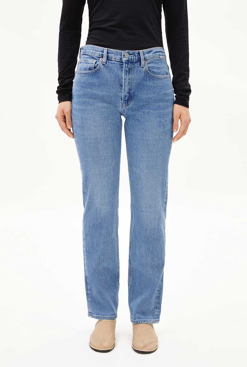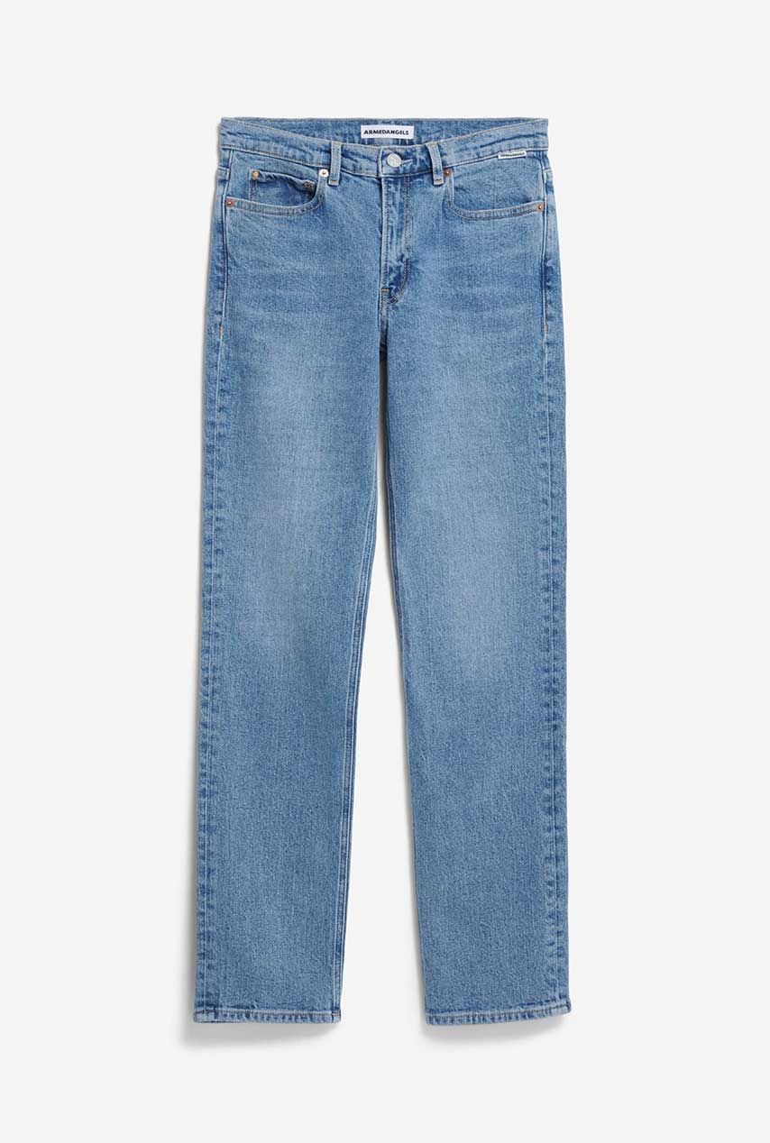Deze blauwe denim jeans van Armedangels is de perfecte basic! De broek is gemaakt van biologisch katoenmix en heeft een fijne stretch door het elastaan. Leuk om te combineren met een blouse of sweater.