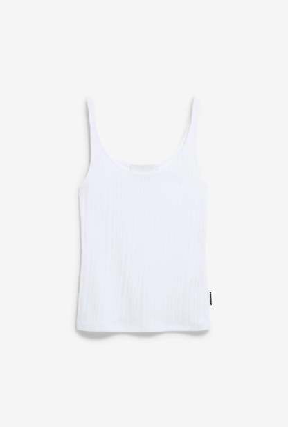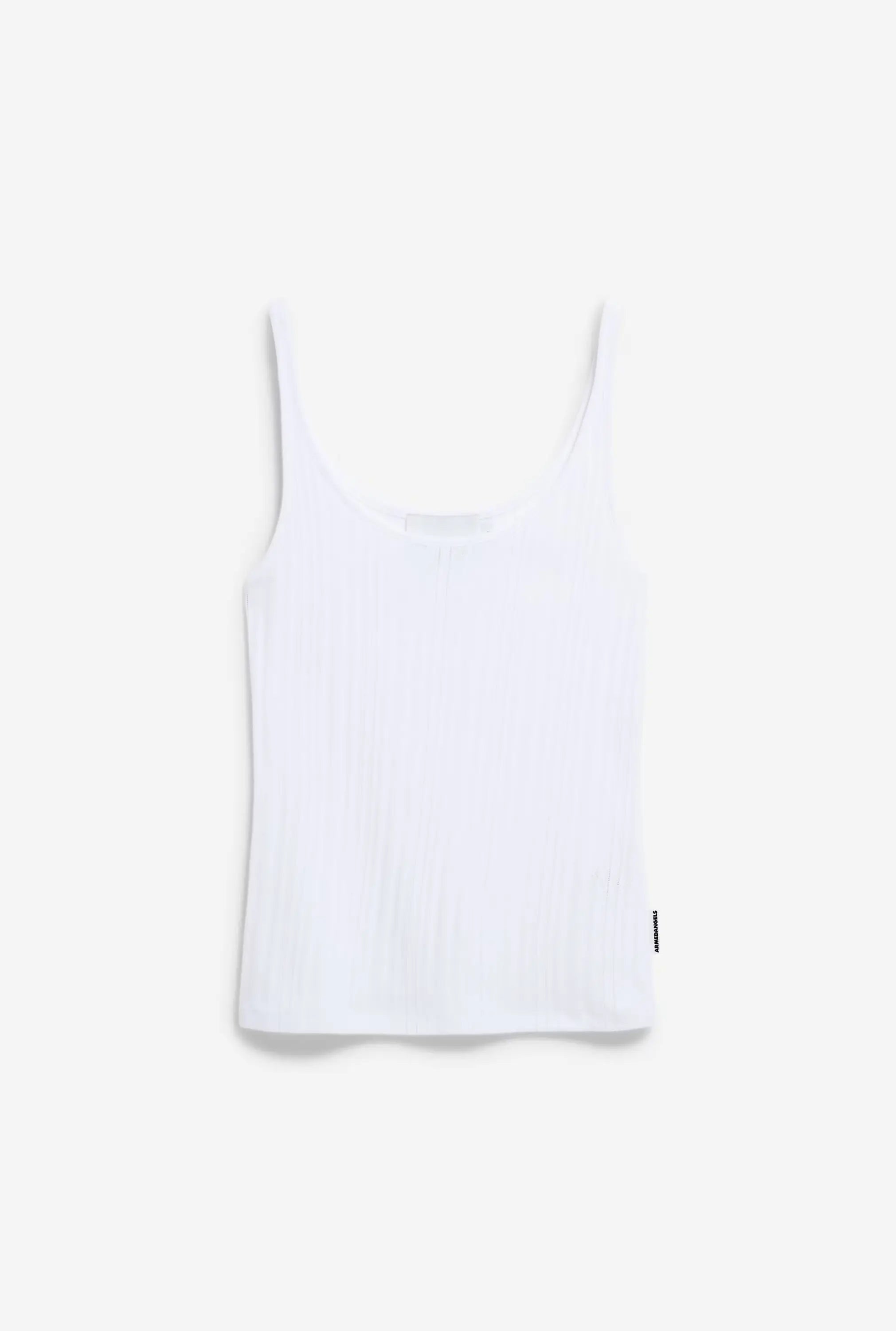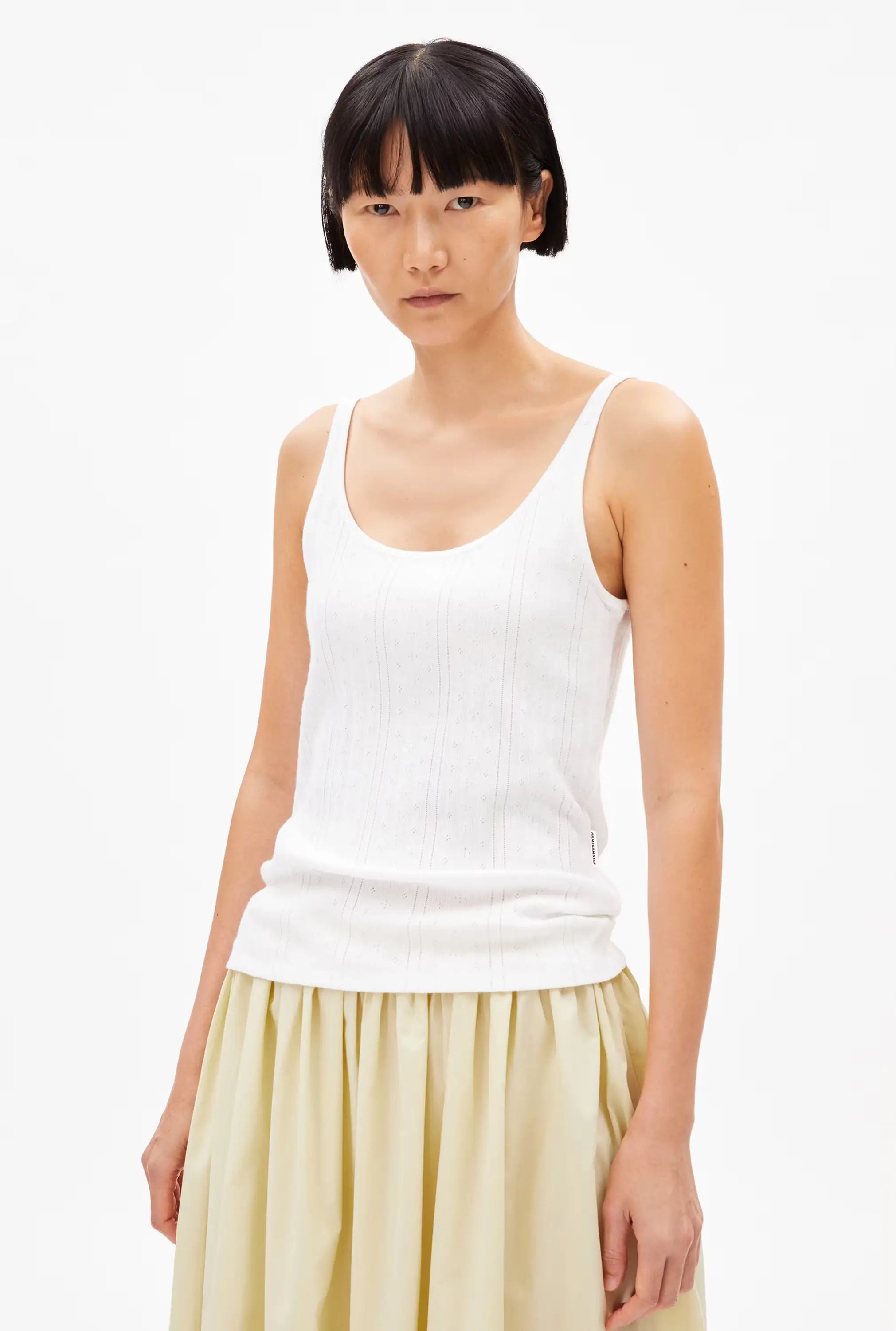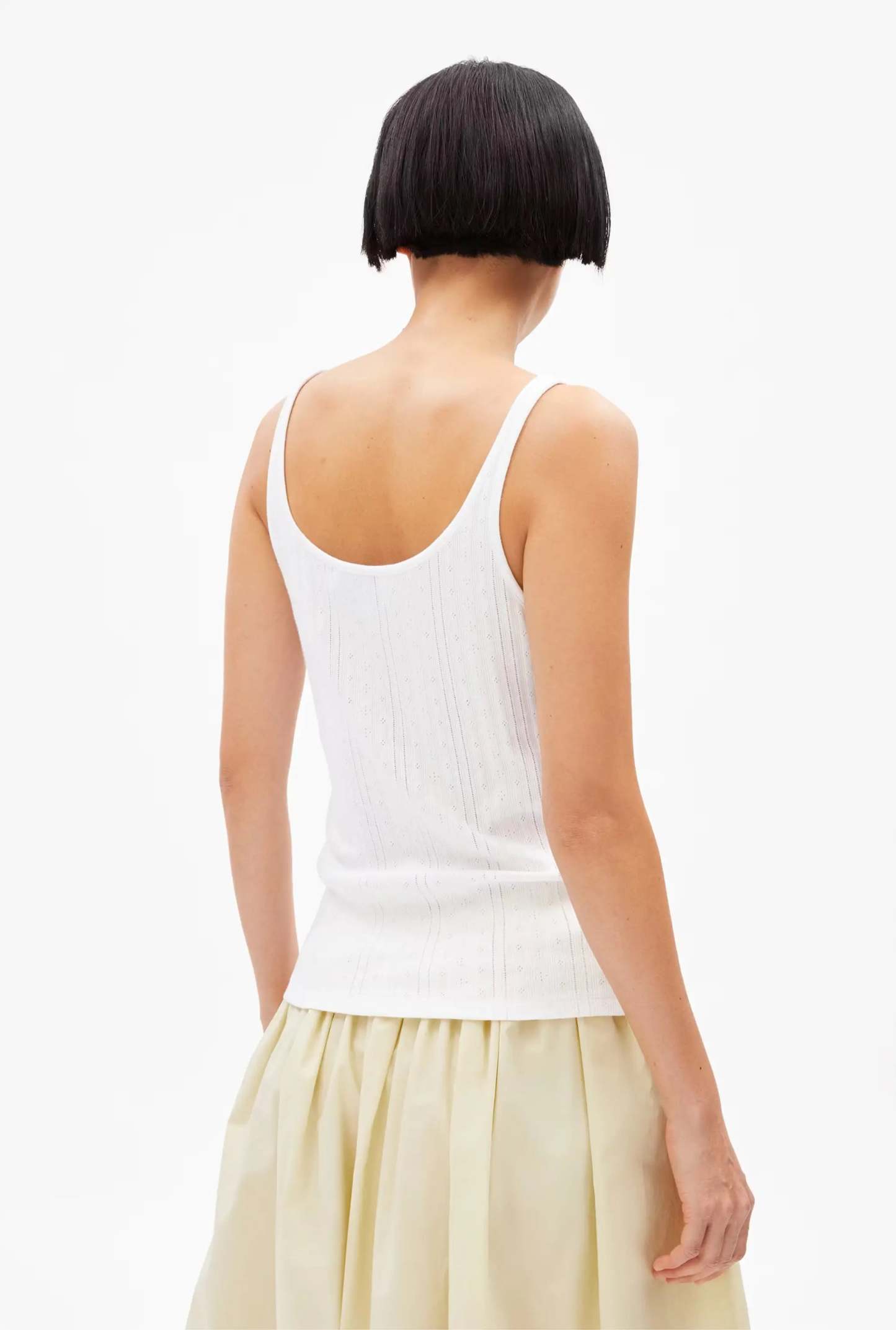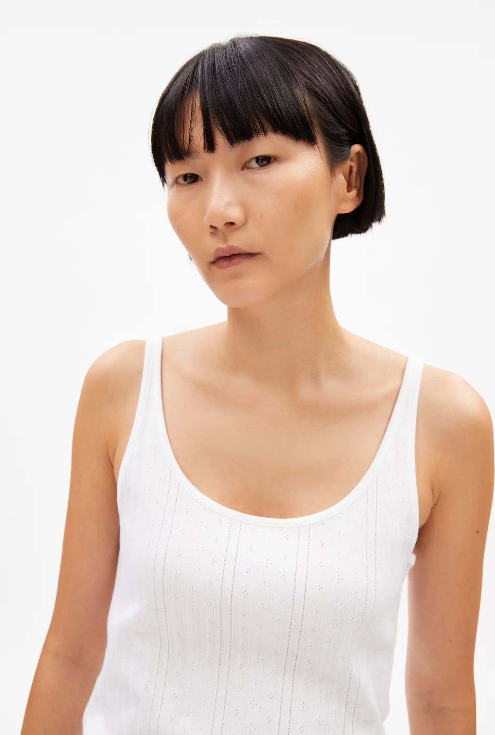 Deze witte top van Armedangels kan niet ontbreken uit jouw garderobe! Het mouwloze hemdje heeft een pointellepatroon en is gemaakt van biologisch katoen. Dit zorgt voor een ademende, comfortabele stof die zacht aanvoelt op de huid. Combineer de top met een jeans of rok voor een zomerse look