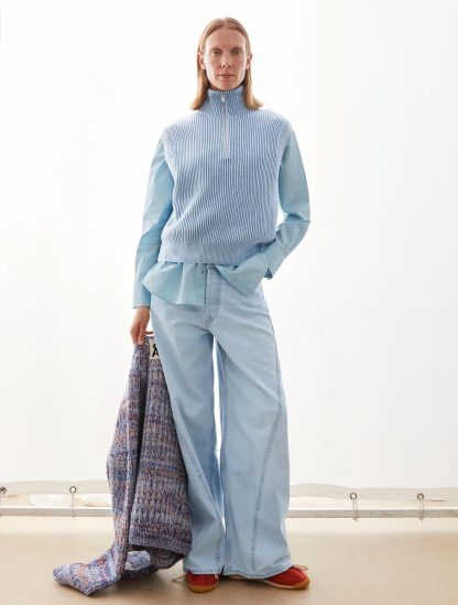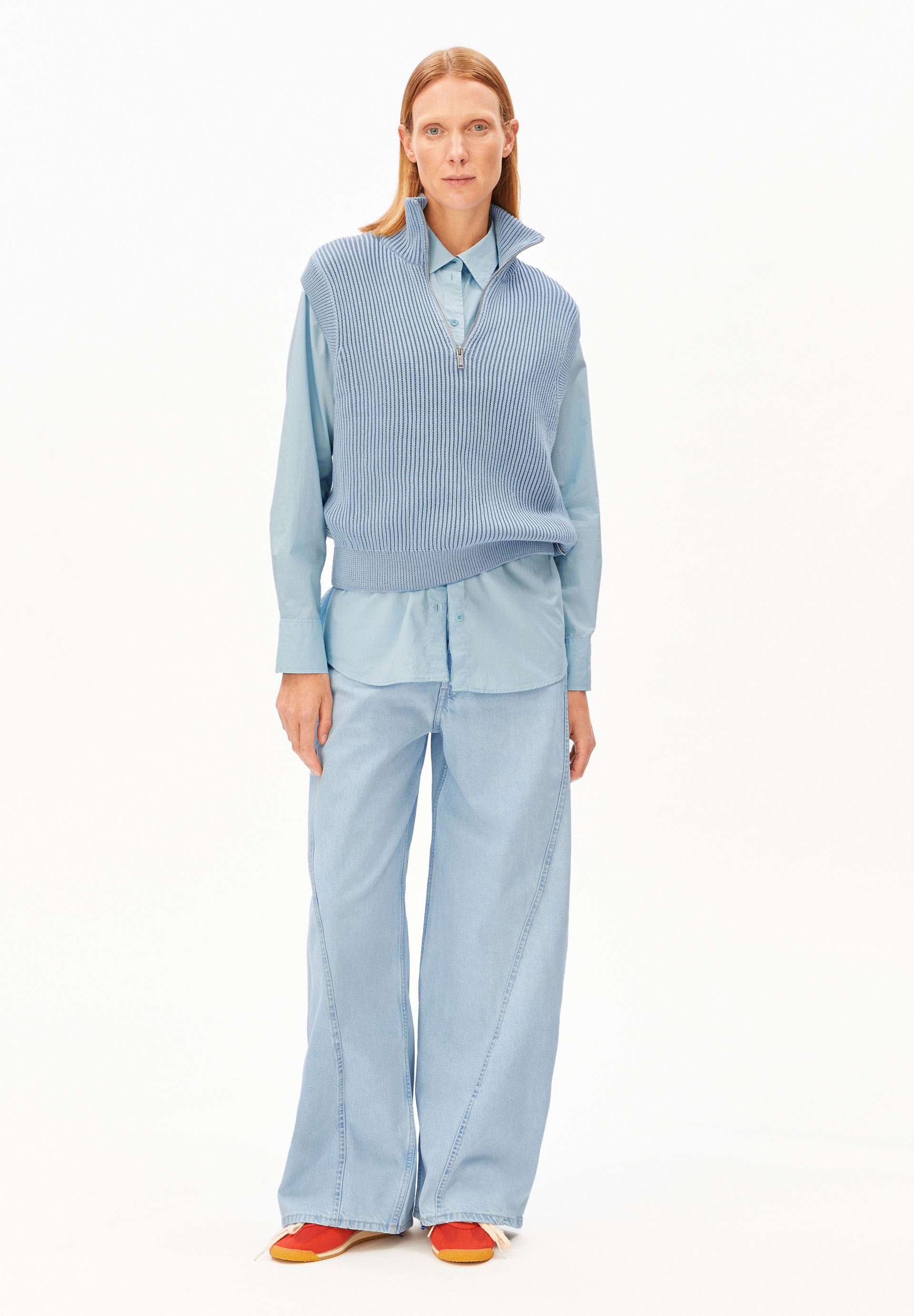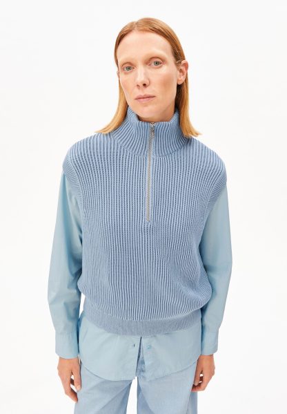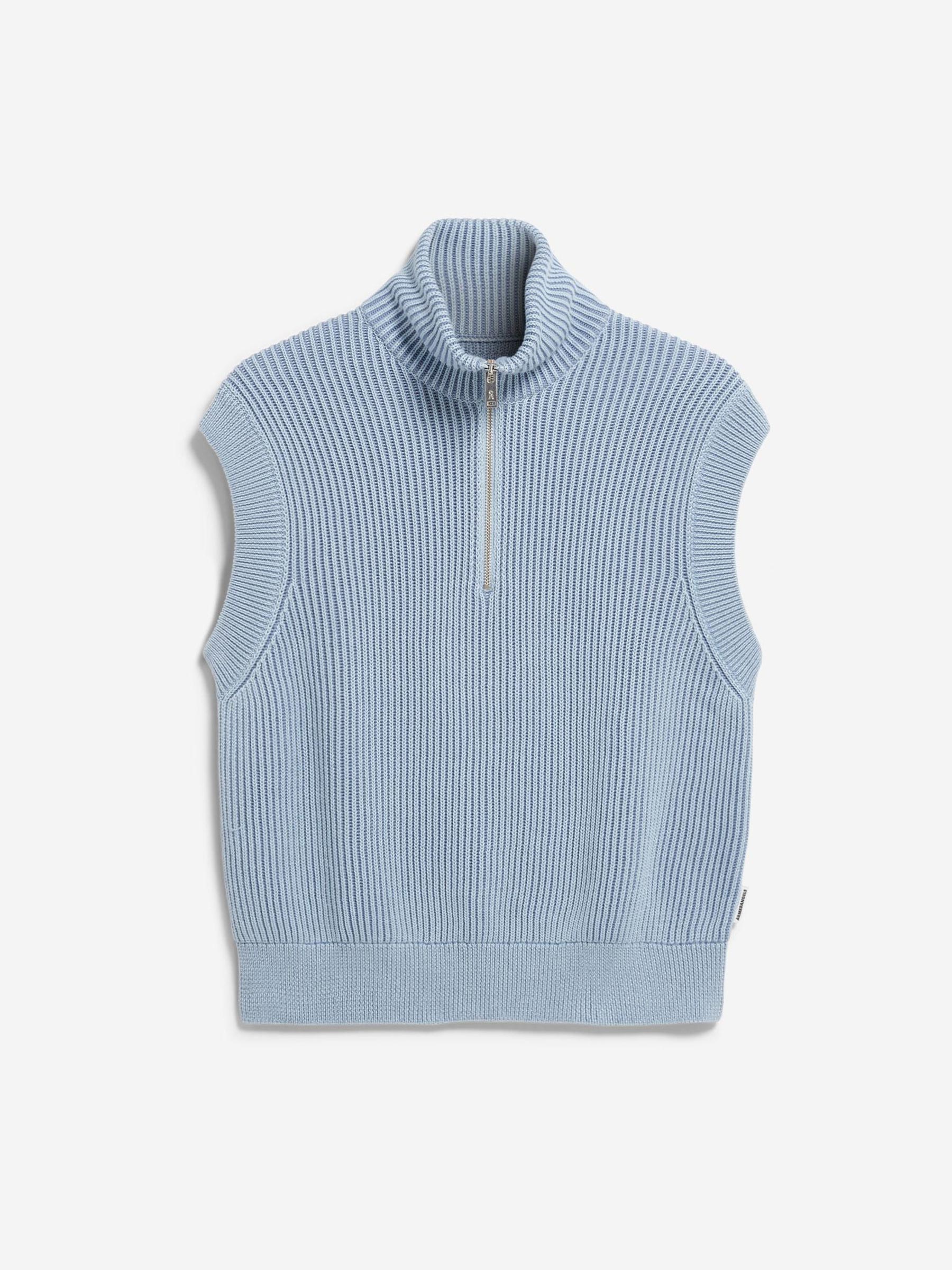 Dit lichtblauwe gilet vest van Armedangels is perfect voor dagen waarop je wilt layeren zonder dat het zwaar aanvoelt. De grove ribstructuur en halve rits geven hem een frisse, moderne look en maken hem easy te stylen over een blouse of long sleeve.