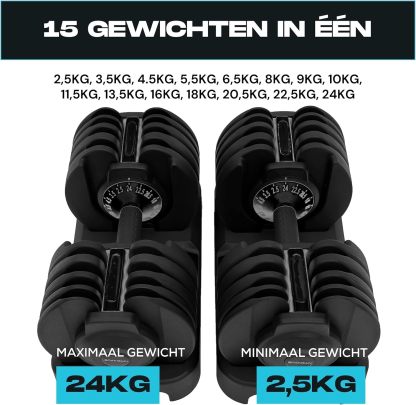- 15 WEIGHTS IN ONE: Focus on your shape with our advanced locking system that holds the weights in place. Easily adjustable from 2.5 kg to 24 kg in precise steps (2.5 kg, 3.5 kg, 4.5 kg, 5.5 kg, 6.5 kg, 8 kg, 9 kg, 10 kg, 11.5 kg, 13.5 kg, 16 kg, 18 kg, 20.5 kg, 20.5 kg, 20.5 kg, 20.5 kg, 20.5 kg, 20.5 kg, 20.5 kg, 20.5 kg, 20.5 kg, 24.3 kg and 24 kg) when the handle is fully locked into the base, allowing accurate progression without compromising safety.