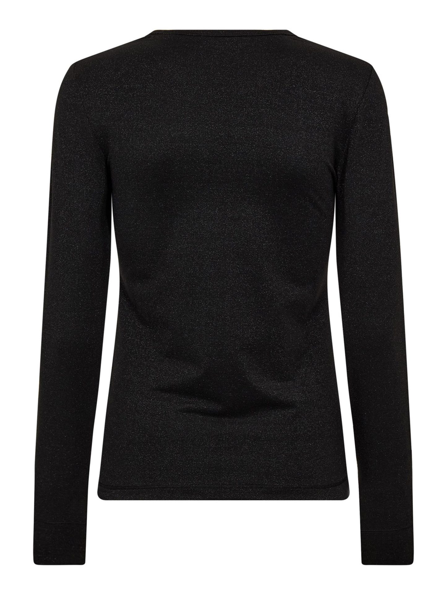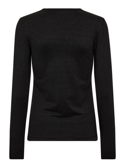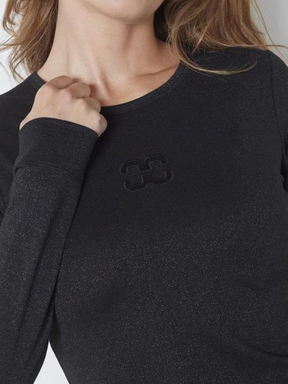 Deze zwarte longsleeve van Co’Couture is de perfecte basic met een subtiele sparkle. De fijne lurex glans en het logo op de borst geven ‘m een moderne uitstraling. Draag onder een blazer of met een wijde pantalon voor een stijlvolle, easy look.