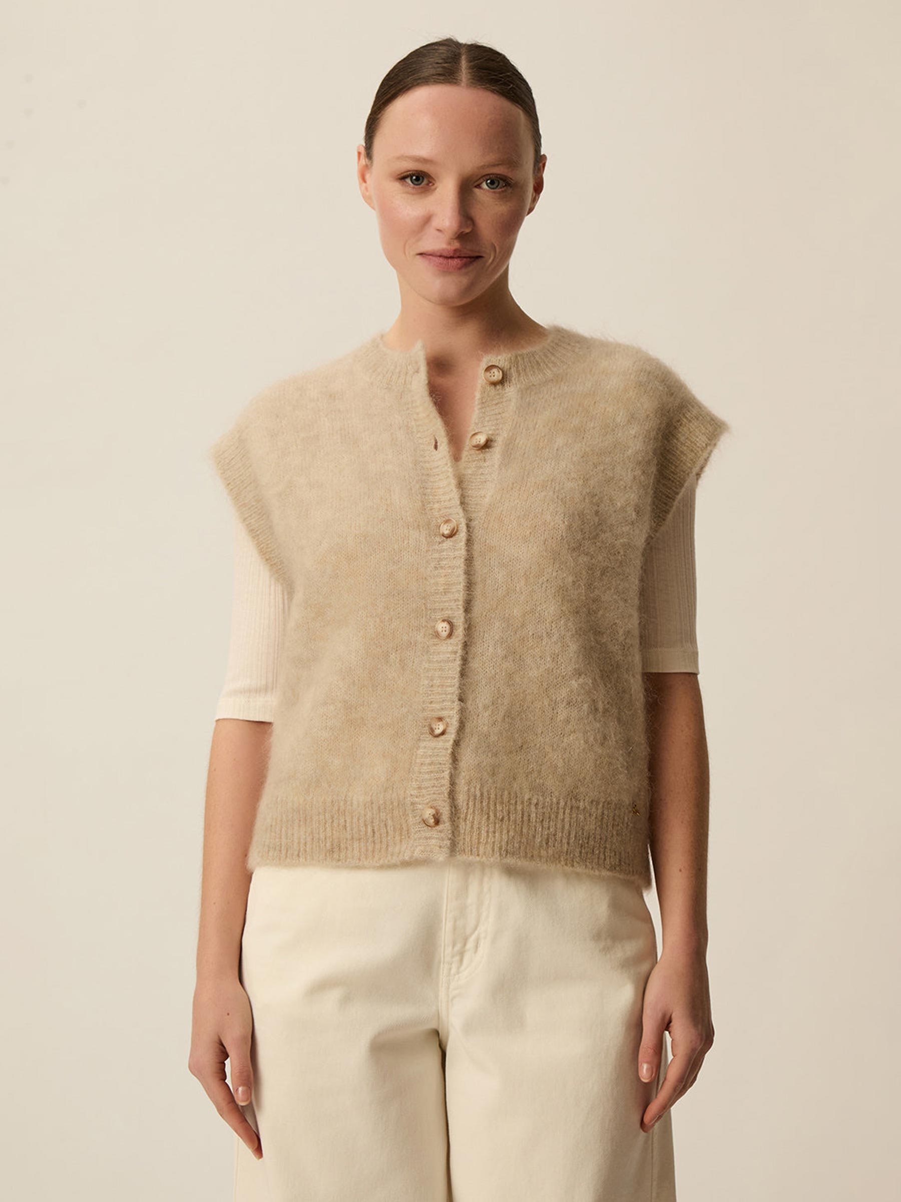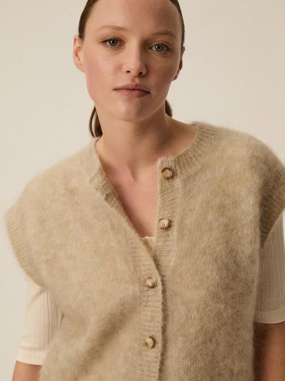 Dit beige gilet van Des Petits Hauts is een heerlijk laagje voor dagen waarop comfort en stijl samenkomen. De zachte knit, knoopsluiting en mouwloze vorm maken het perfect om over een blouse, shirt of jurk te dragen en geven elke outfit meteen een warme uitstraling.