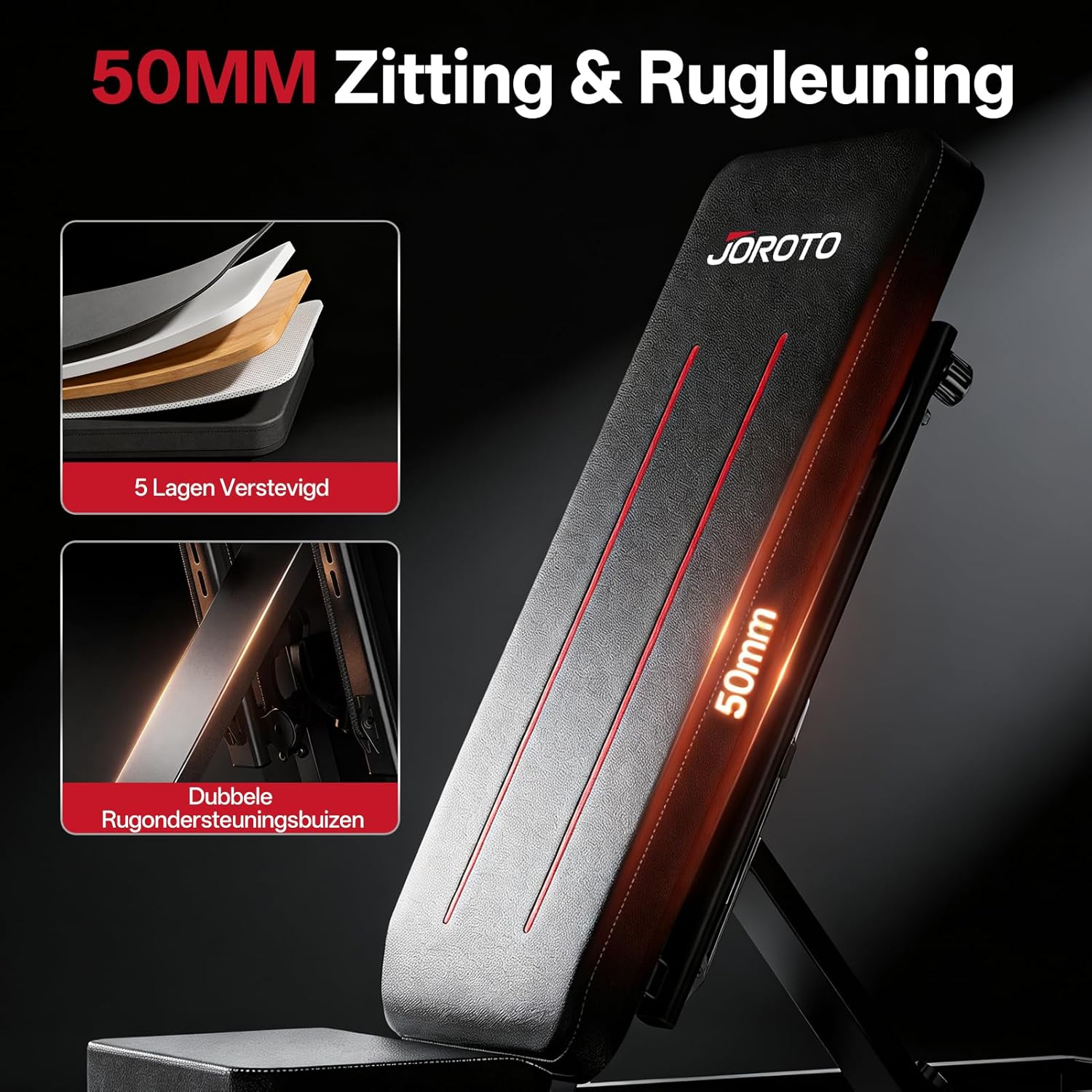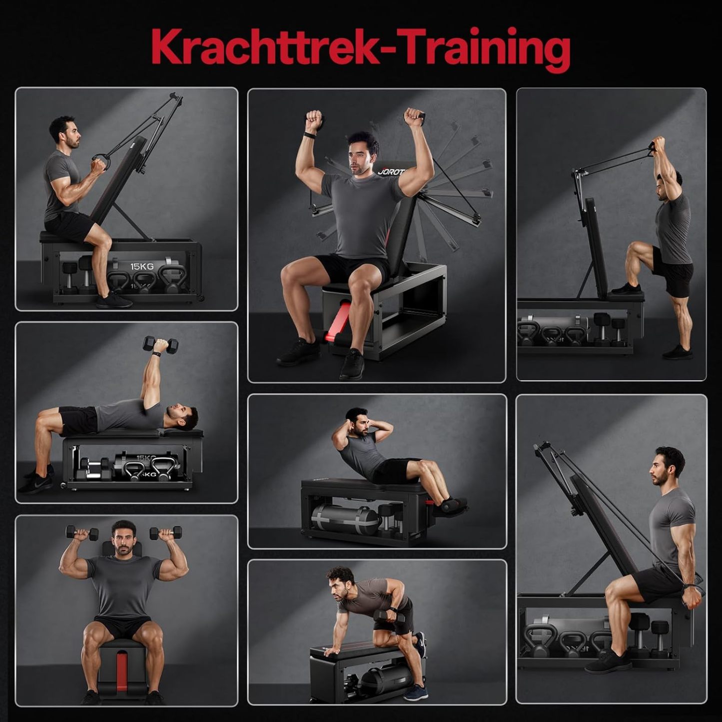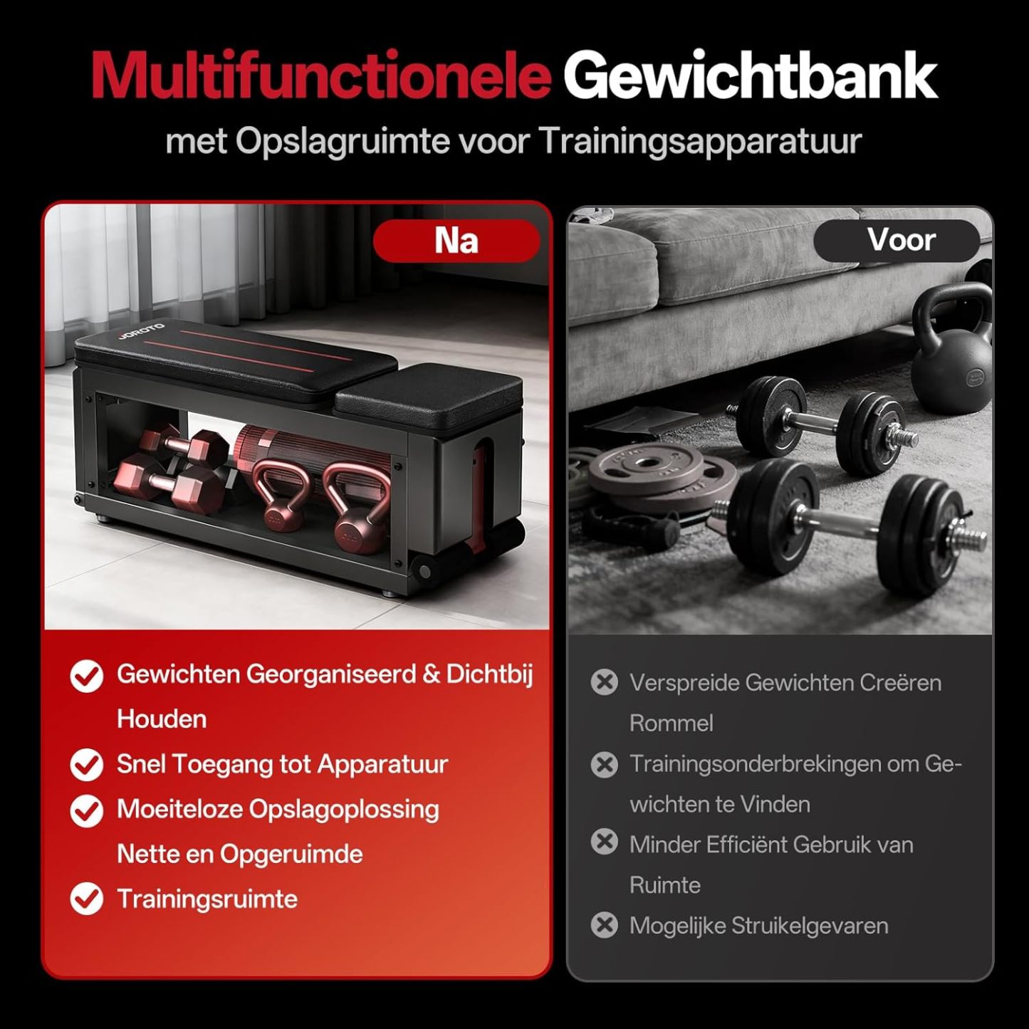 - WEIGHT BANK WITH STORAGE – CLEAN TRAINING: Should you always pick up weights lying around? The JOROTO MD85 weight bench has a built-in storage compartment to safely store your discs and accessories – no more tripping hazards and no search between sets. Keep your workout area clean, safe and organized, with everything at your fingertips, so you can train focused and efficiently in a professional home gym environment.