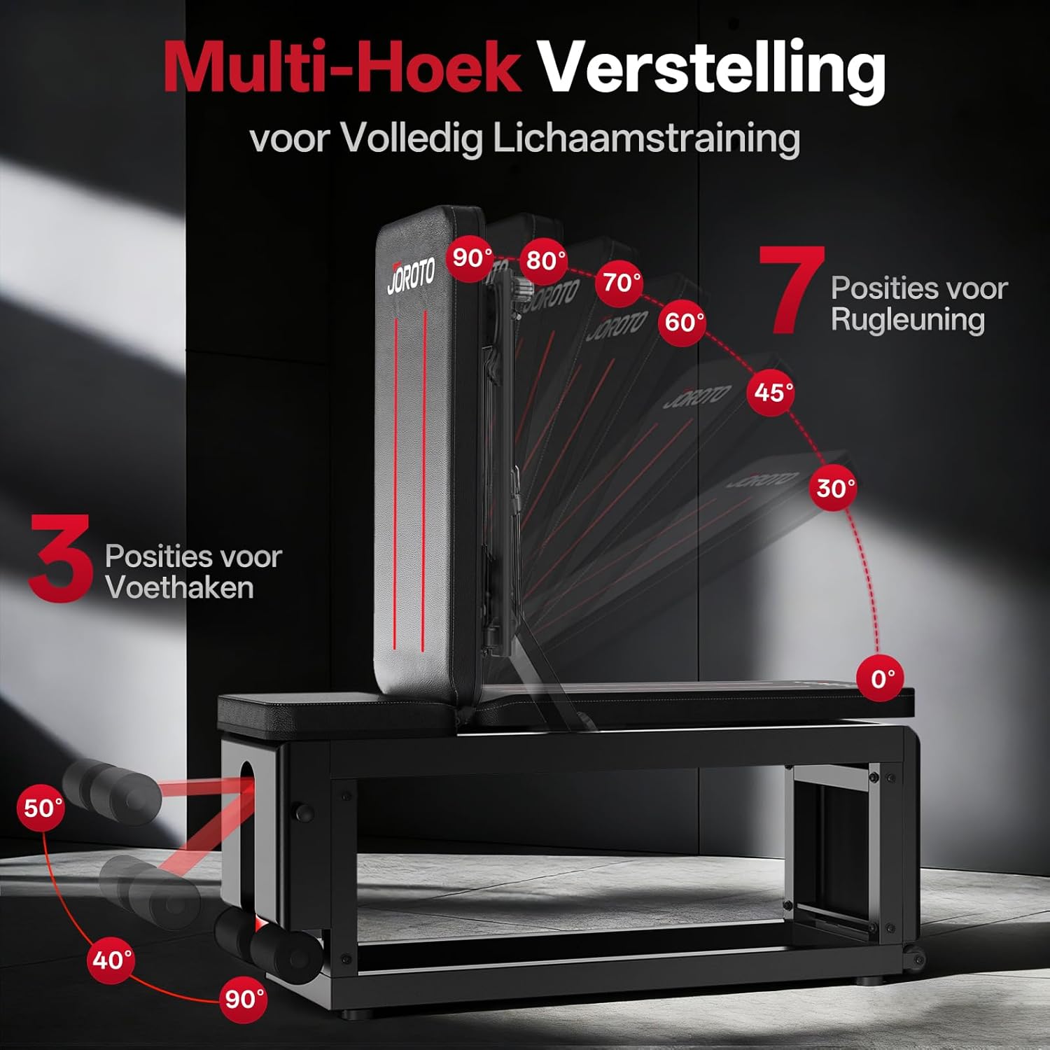 - ULTIMATE 7+3 ADJUSTABLE WEIGHT BANK: JOROTO MD85 Adjustable Weight Bench offers versatile training with a 7-position backrest (0° to 90°) and a 3-angle foot hook (40°, 50° and 90° vertical). Effortlessly switch between flat, inclined and upright positions to train chest, core, legs and the whole body. Gym stability and smooth setting for safe training and achieving your fitness goals at home.