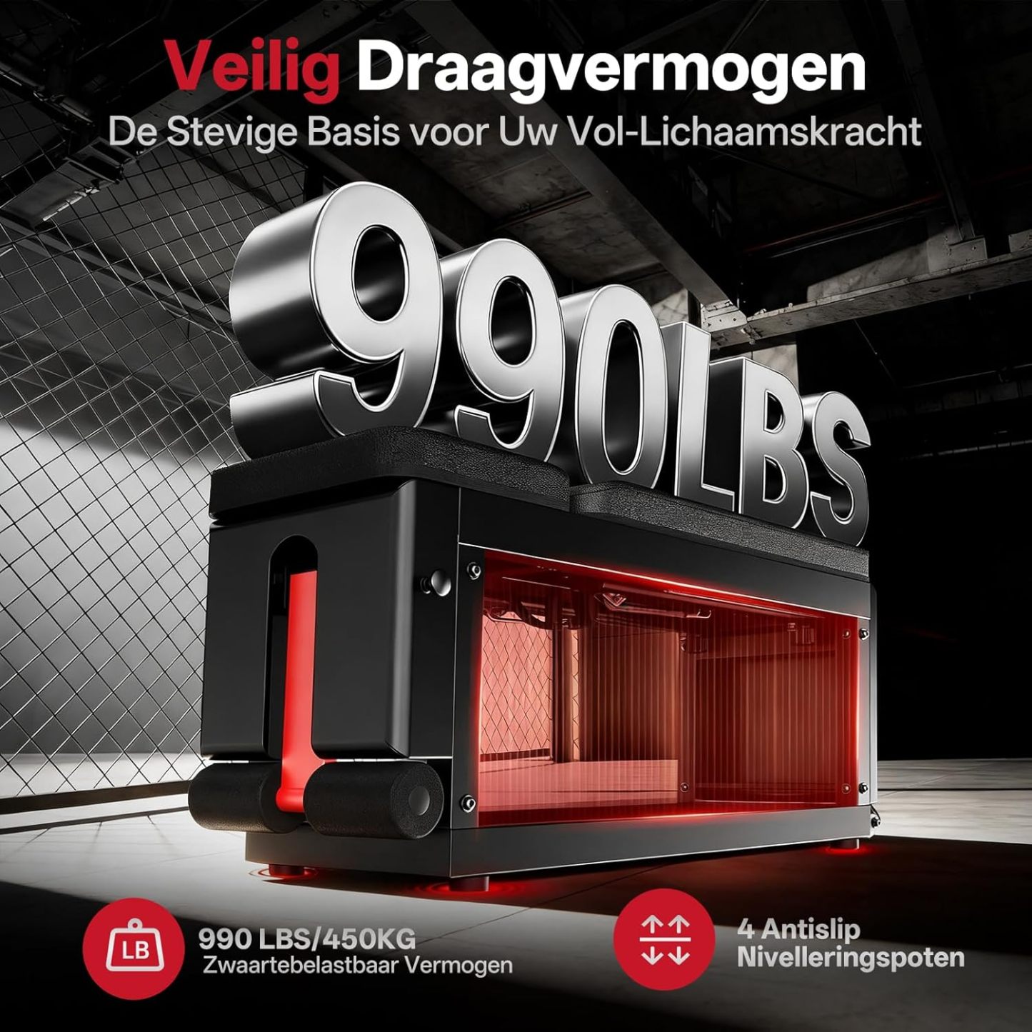 - BLACK-LOADABLE 450KG & ROCK FIXED STABILITY: Exercise confidently on this high quality fitness bench, designed to safely carry up to 990lbs / 450kg. With 4 non-slip, adjustable leveling legs, it guarantees rock-solid stability on any floor. Built for serious athletes, this bench provides a safe, cradle-free base for heavy presses, squats and full-body training – to push your limits safely and effectively, at home or in the gym.