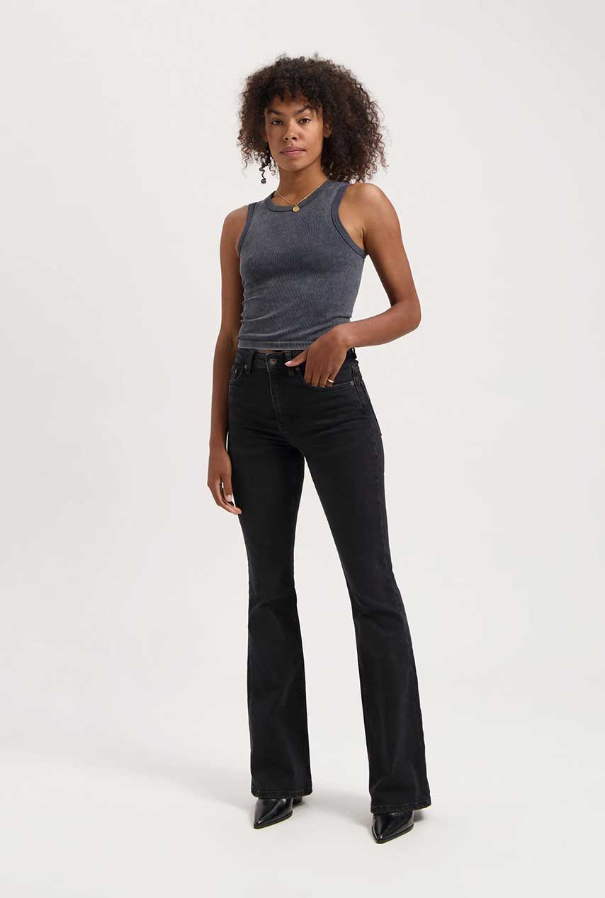 Deze antraciet flared jeans van Kuyichi is een echte favoriet en dat voel je! Extra hoge taille, wijde flare en een fit die mooi aansluit én comfortabel zit. Dankzij de mix van duurzame materialen beweegt deze jeans met je mee, de hele dag door.