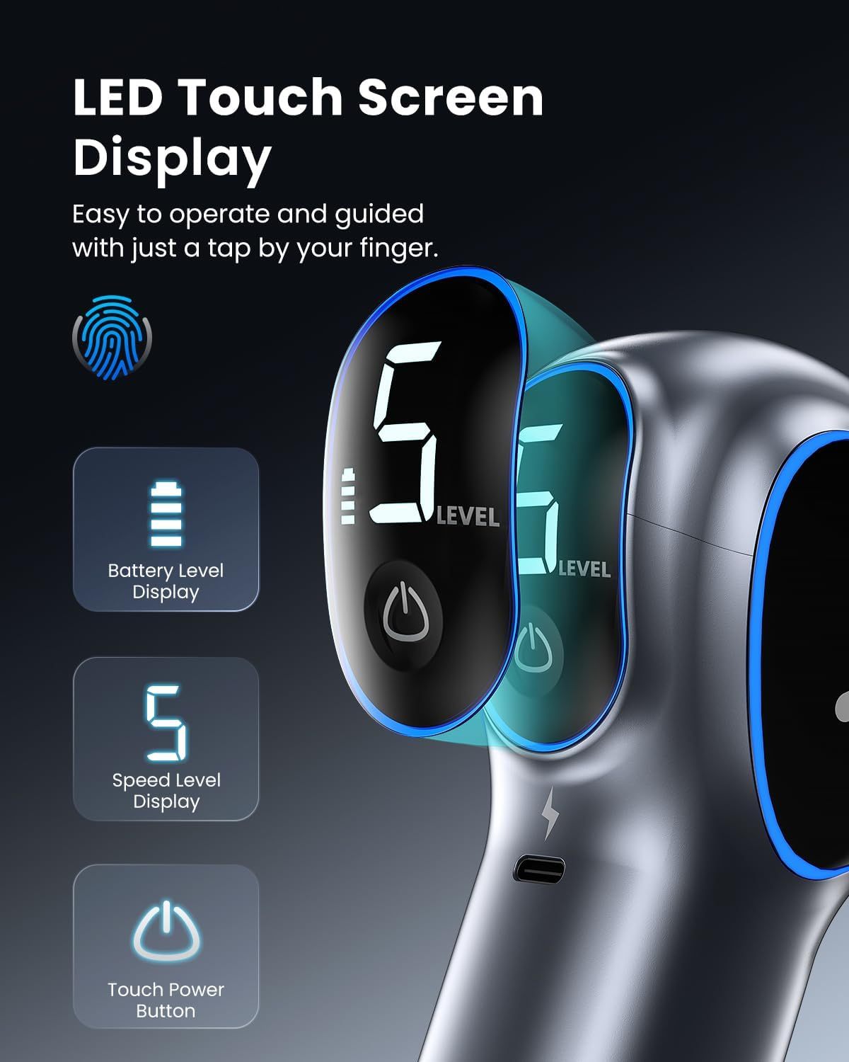 - LED touch screen and automatic mode: LED screen displays battery and speed level. 4 massage heads and 5 speed levels to meet all your needs. Customize your massage experience further with automatic mode, which quickly goes up and down based on the pressure applied.