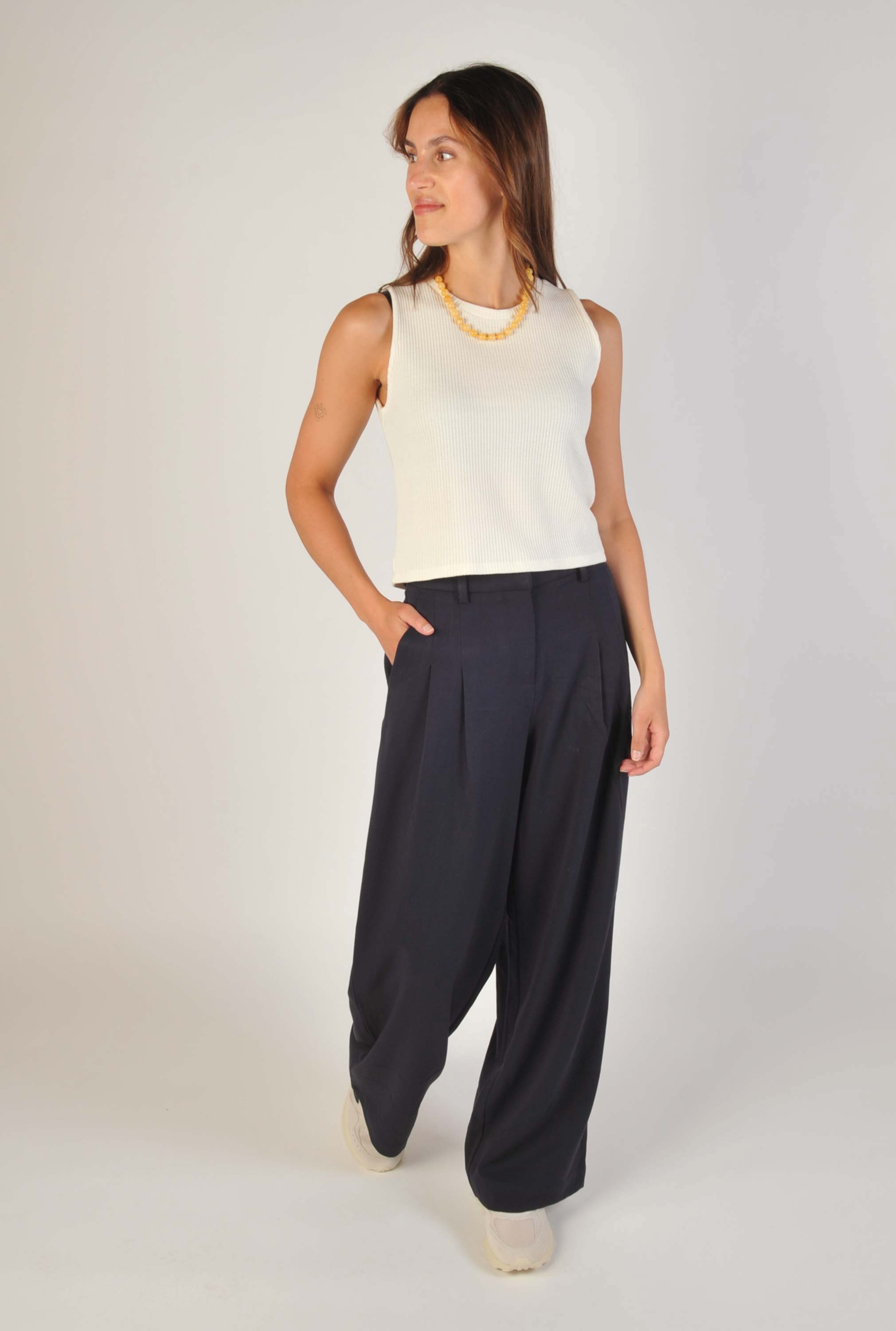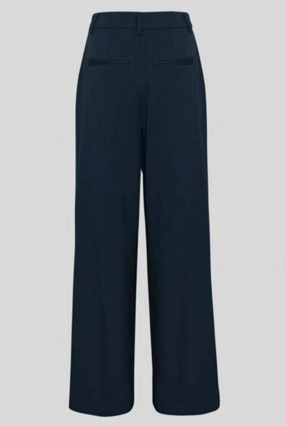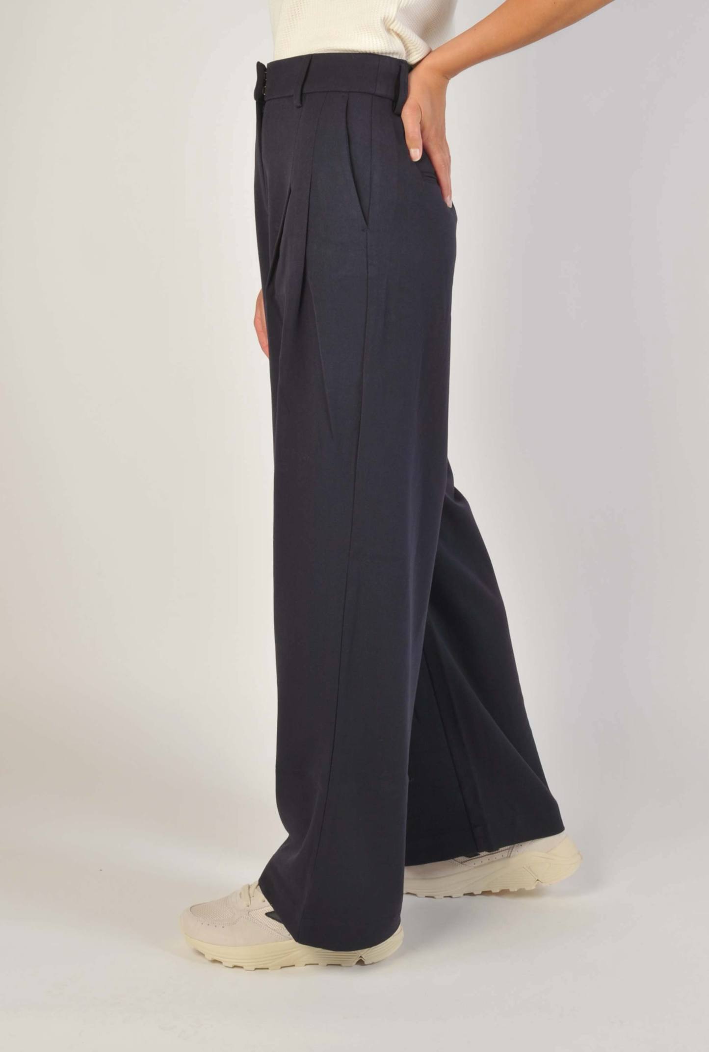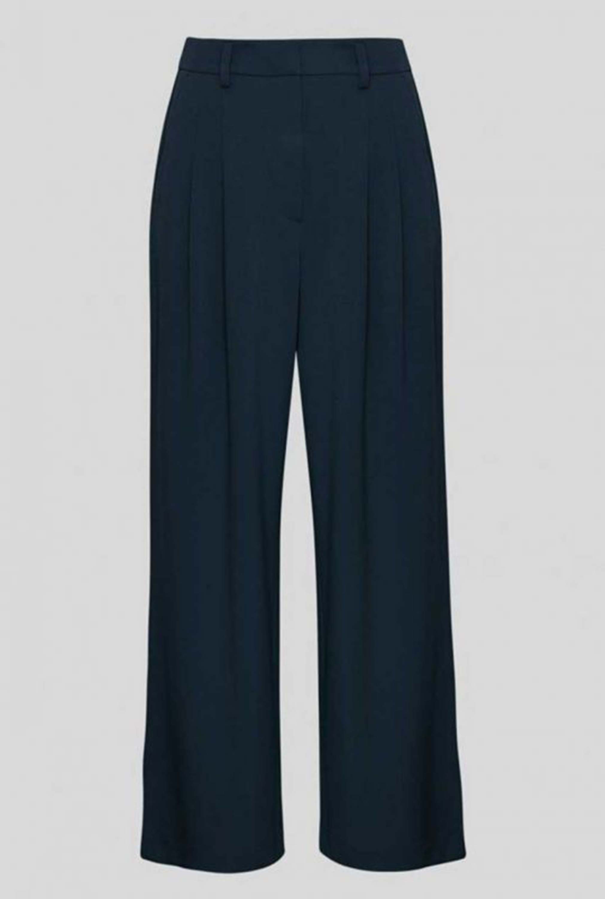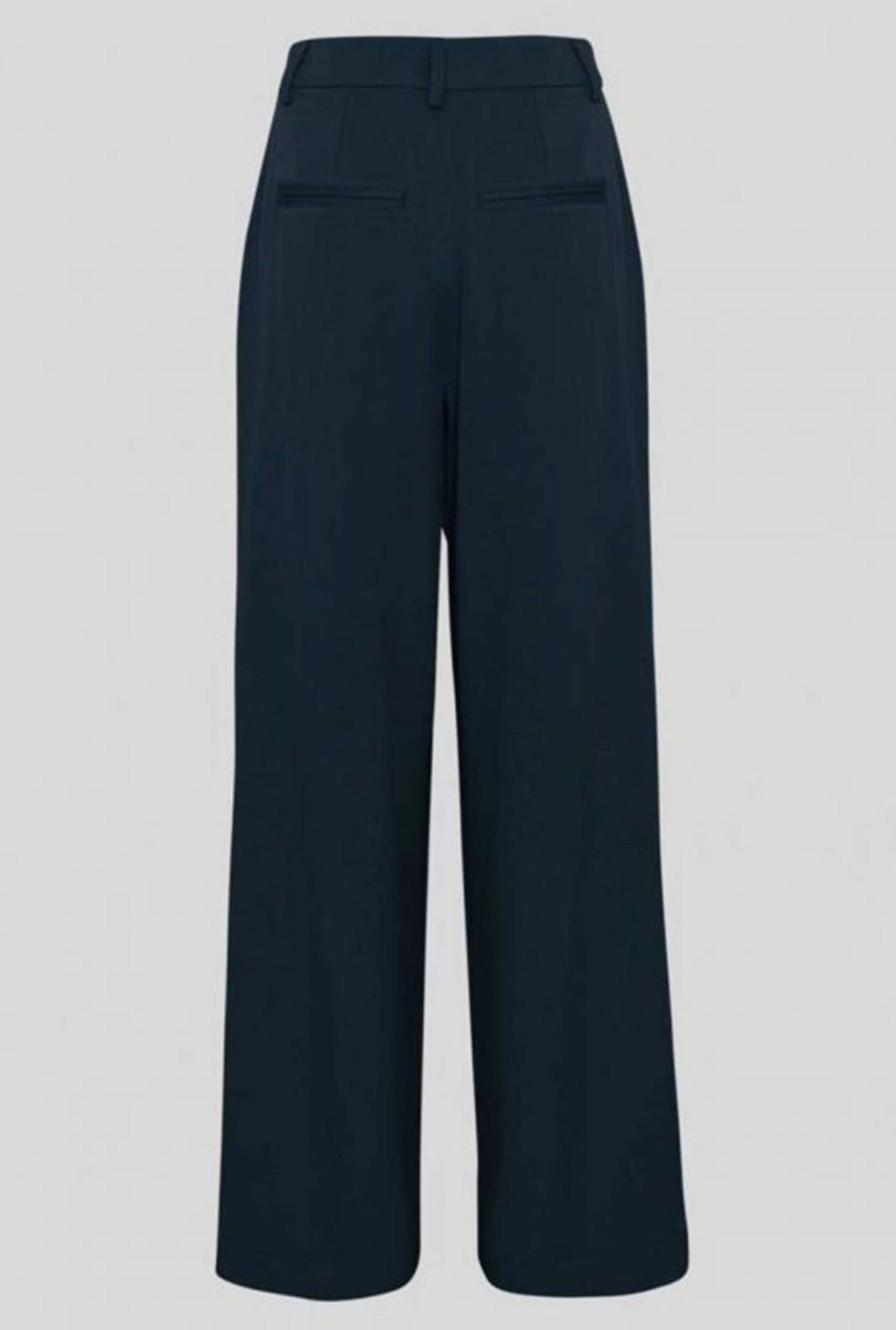 Deze klassieke pantalon van MSCH Copenhagen heeft een wijde pasvorm en een hoge taille. De broek heeft geplooide details aan de voorkant, wat de pantalon een elegante uitstraling geeft. De donkerblauwe kleur geeft de broek een tijdloze look.