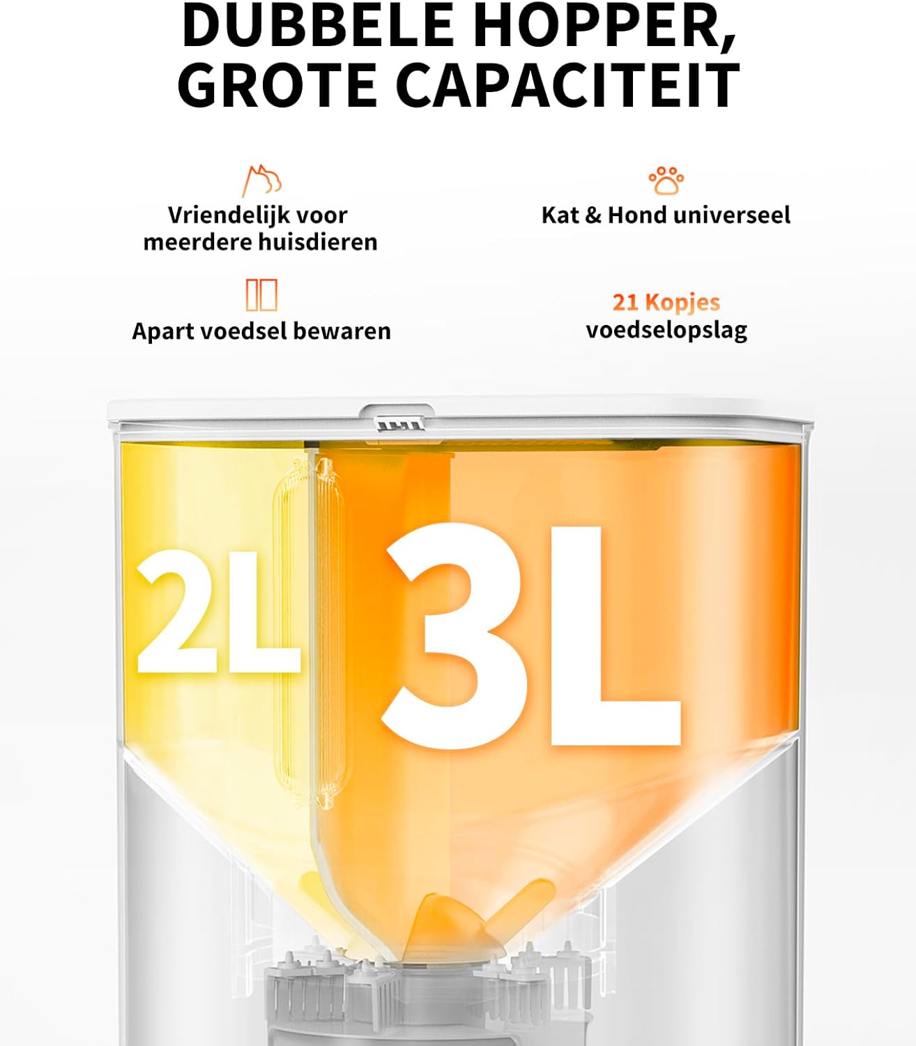 - [5L Double Funnel] The double funnel design distributes different types of food, ideal for multi-cat households or fussy cats, and solves food transition problems (Food size < 12mm). Quadruple food keeping system keeps food dry. Anti-clogging design ensures even distribution of feed. Double feeding system ensures no food is lost (Batteries not included).