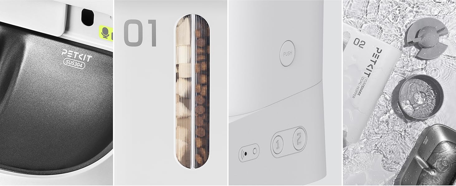 - [Real-Time Observation] The PETKIT YUMSHARE Double Funnel Automatic Cat Feeder with Camera has a 1080P high-resolution camera and a wide 140° viewing angle that intelligently switches to night vision mode. Watch your beloved pet in real time. In the app, set how long the camera is on. Detect your pet when you leave. Turn it off when you don't need it to protect your privacy. (Some video cloud storage services require you to make in-app purchases; go to the PETKIT APP for more information).