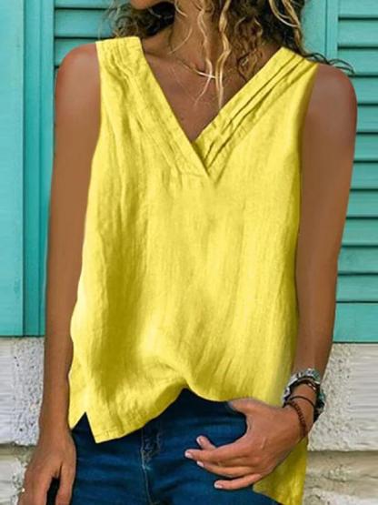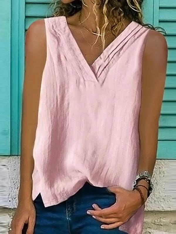 Ladies Cotton Linen V-Neck Hem Bifurcated Sleeveless Shirt