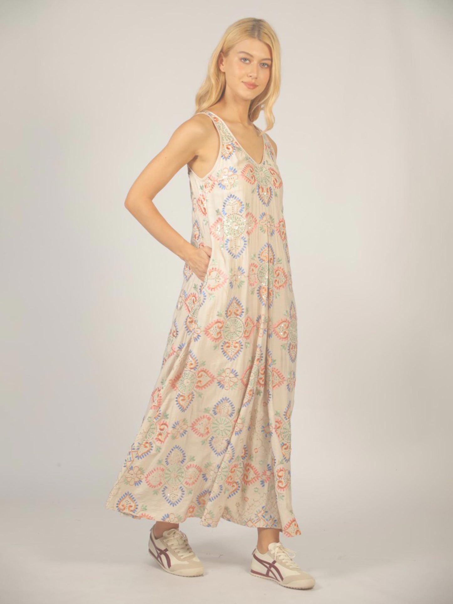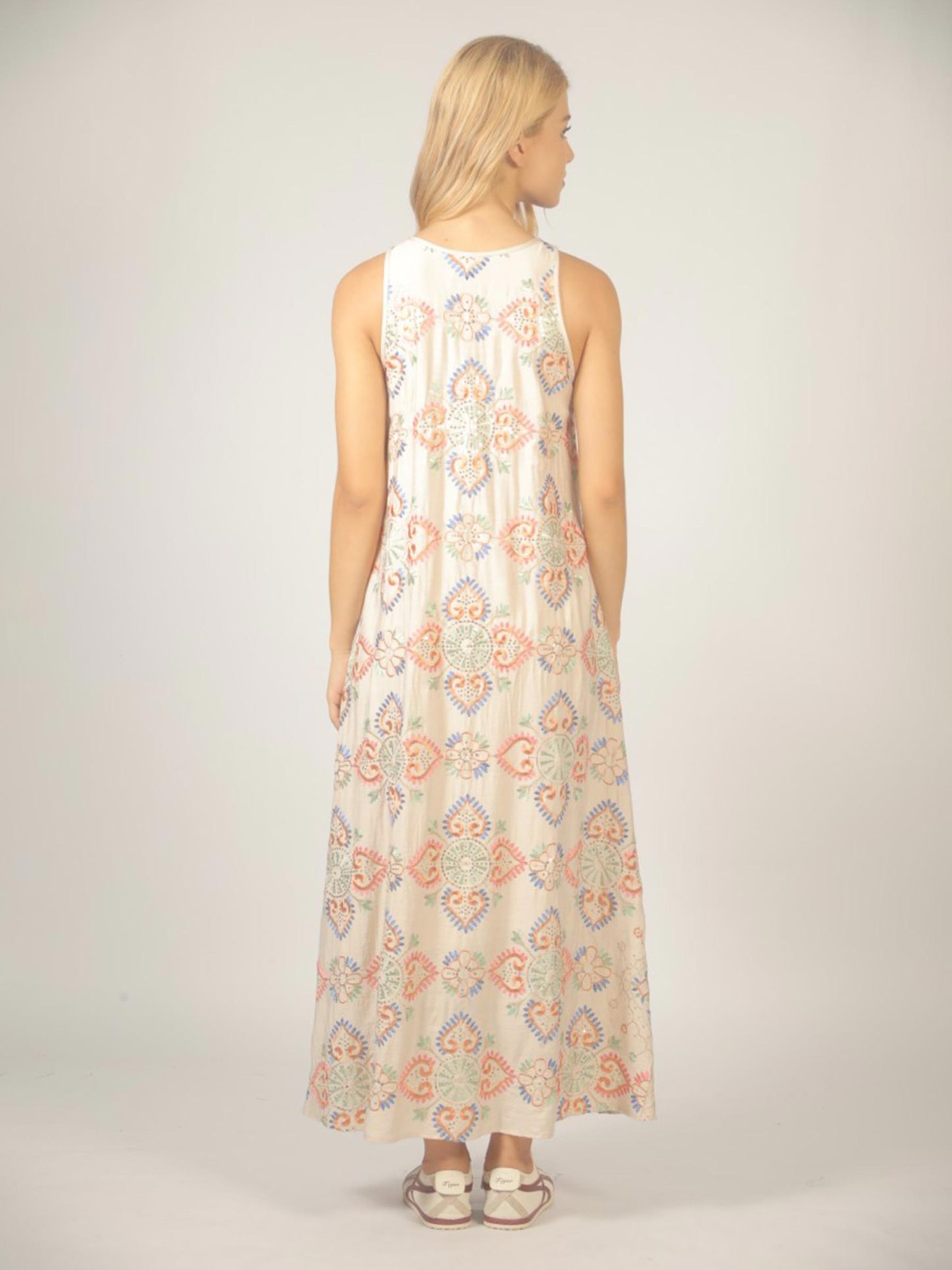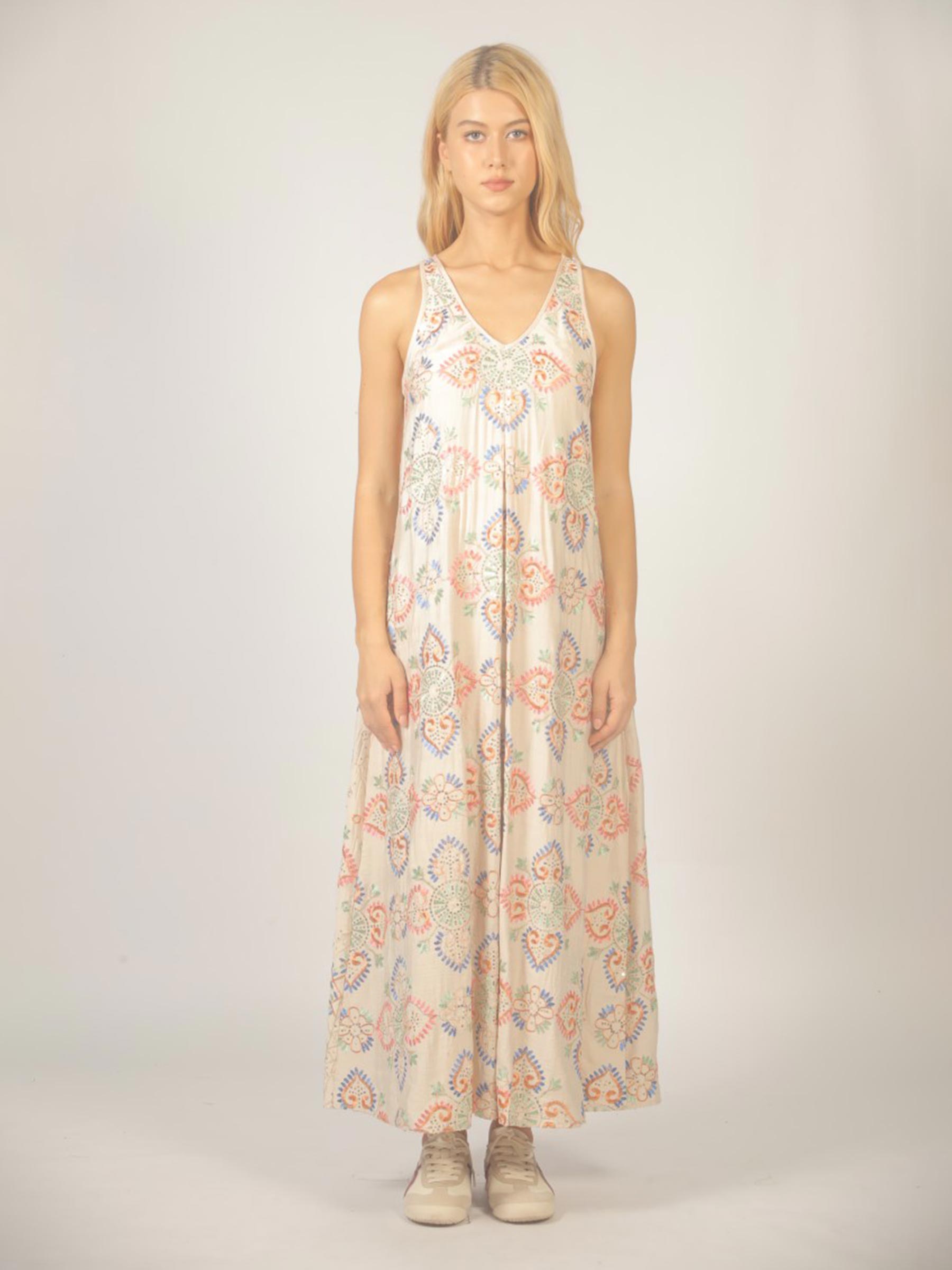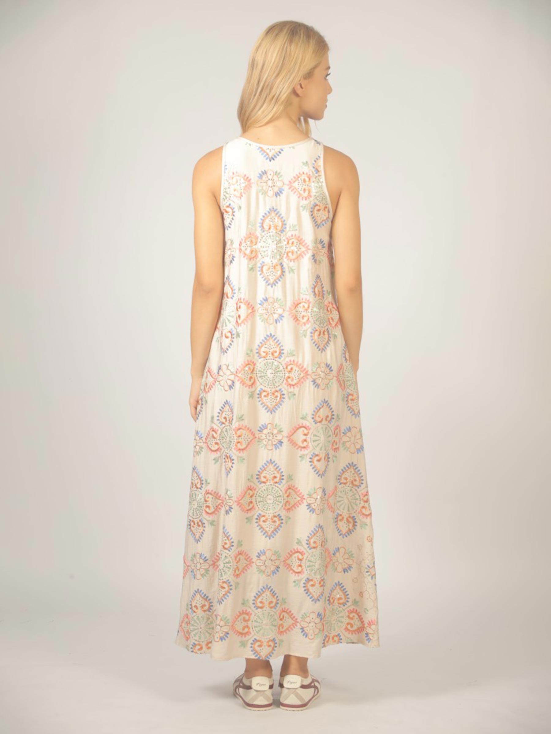 Beige geborduurde maxi jurk