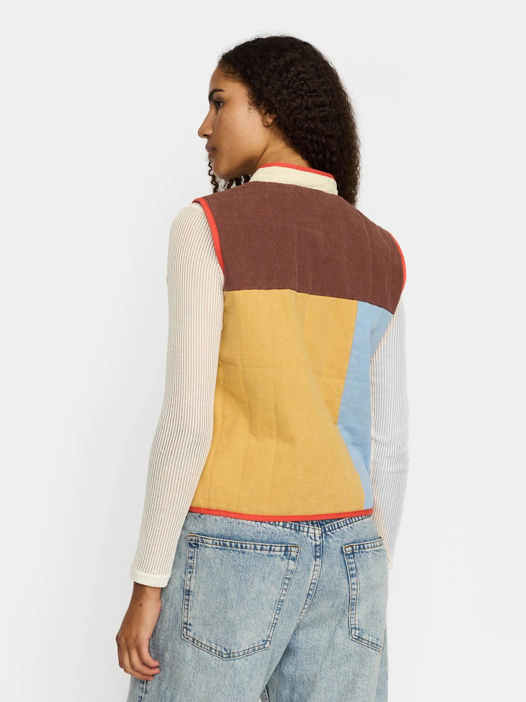 - Offwhite quilted vest met kleurblok-detail en staande kraag