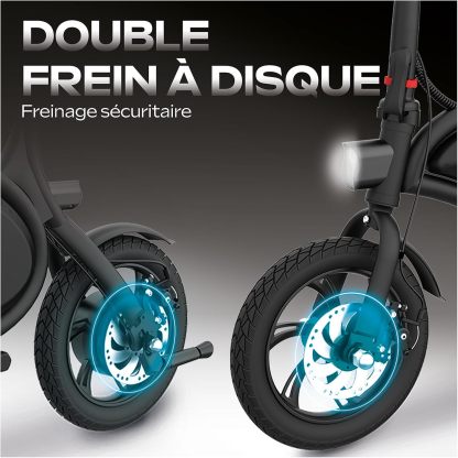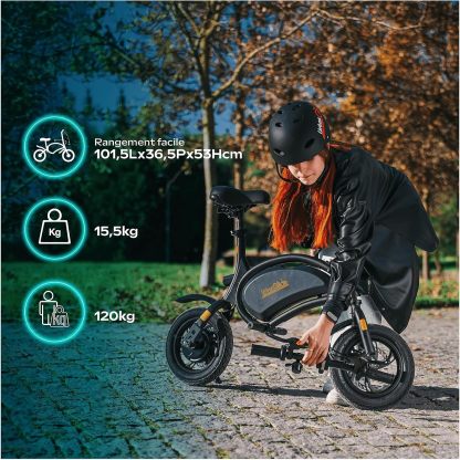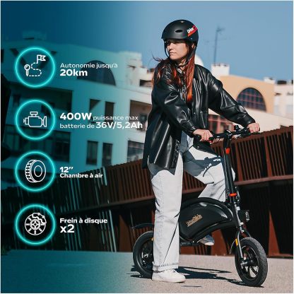 Uitgerust met 12 inch wielen, een schijfrem achter en een 36 V 6 Ah lithiumbatterij, begeleidt hij je tot 18 km autonomie. Het snelvouwsysteem, de verstelbare zitting en de geïntegreerde accessoires (draaggreep, voetsteun, standaard) maken hem tot een ideale bondgenoot voor dagelijks woon-werkverkeer.